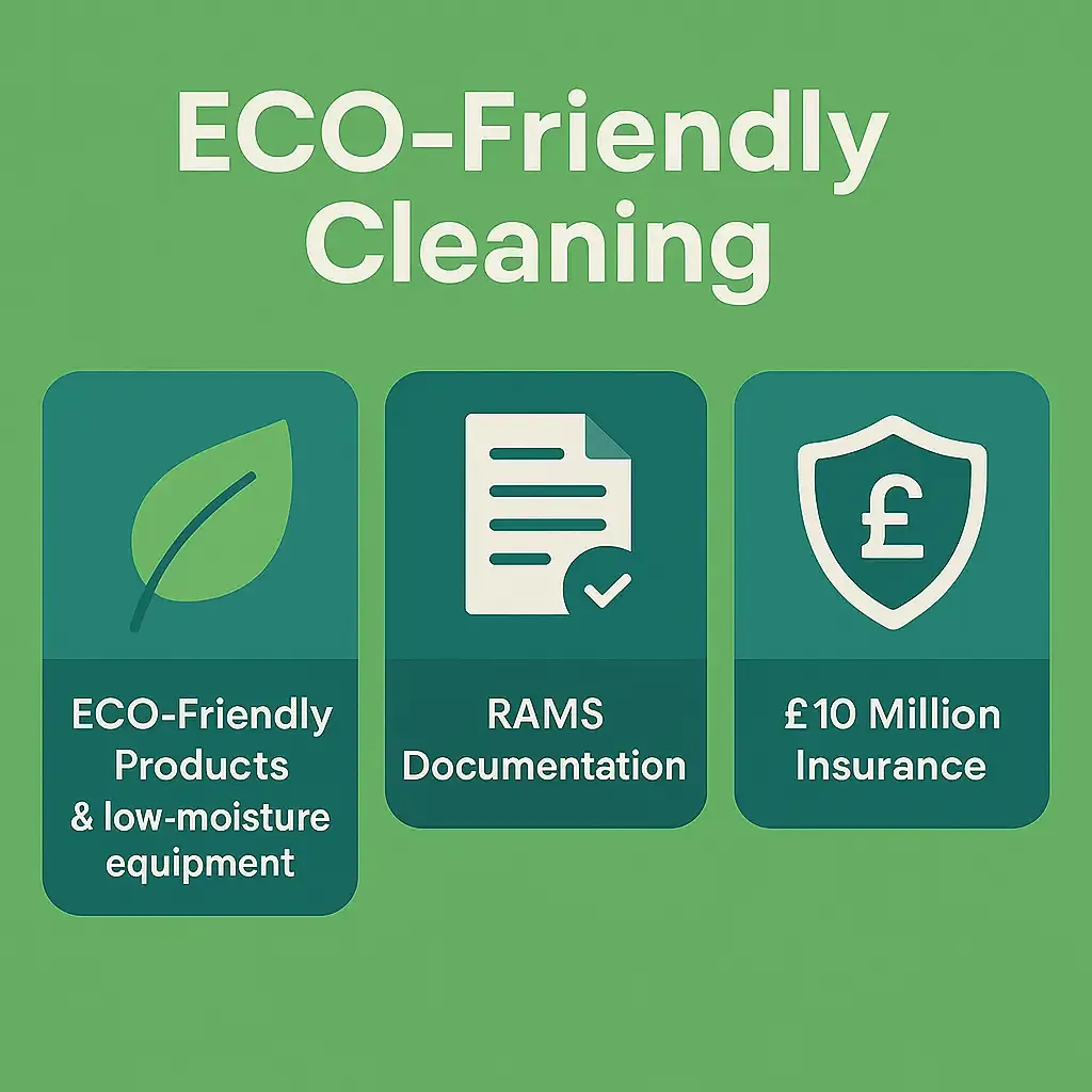 Every site clean is carried out to NHS-level hygiene and safety standards, backed by full RAMS documentation and £10 million insurance for total peace of mind.